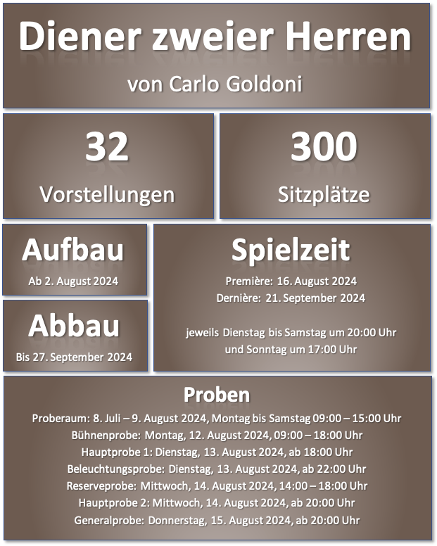 Wir haben Grosses vor, doch auch wir müssen mit dem ersten Schritt beginnen. Das bedeutet, dass wir im ersten Jahr nicht direkt drei, sondern nur ein Stück auf die Bühne bringen werden. Um aber bereits von Anfang die Seele des Theaters einzufangen, haben wir uns entschieden, mit einer klassischen Komödie zu starten. Wie die Saison 2024 aussehen könnte, sehen Sie im nachfolgenden Bild.